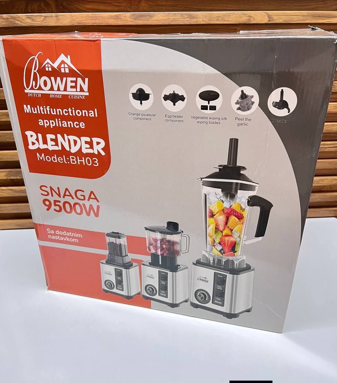 Blender professionnel 9500W, mixeur BOWEN BH03, blender multifonction 4 en 1, robot mixeur cuisine, blender puissant pour jus, extracteur de jus, mixeur cuisine maroc, blender avec accessoires, blender avec hachoir, blender pratique cuisine moderne.